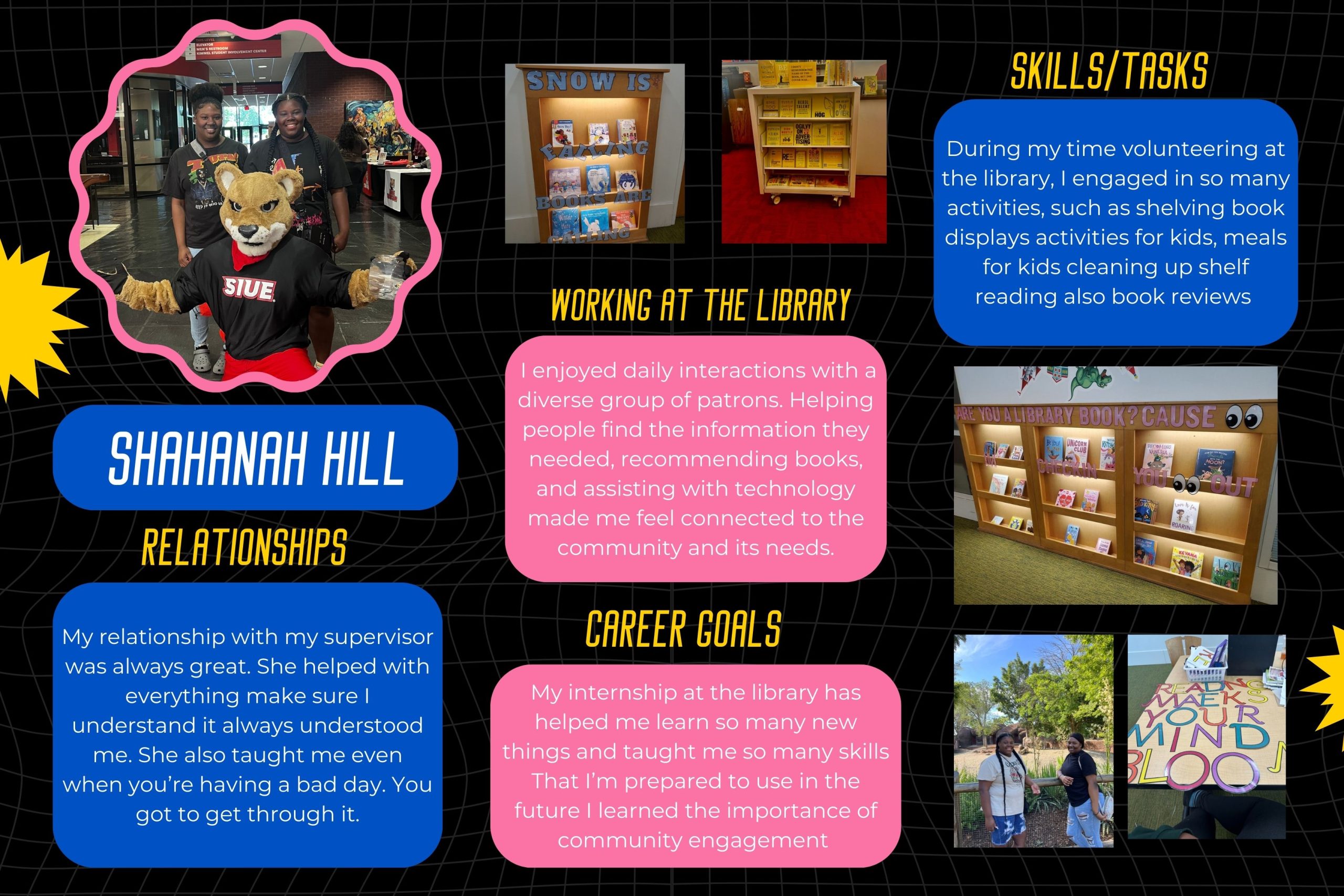 We designed our program to include an event at the end of the program year that allowed students the opportunity to reflect on their experience in the program and to continue to explore librarianship with their mentors. We called this three-day event Summer Institute. Summer Institute evolved over the three cohorts due to both student needs and things we learned. Our first cohort ended with one student, so Summer Institute was incorporated into our trip to the American Library Association (ALA) Conference in Washington, DC and included a visit and tour of the Library of Congress. Cohort 2 provided us an opportunity to build deeper mentee/mentor relationships by bringing the students to Southern Illinois University Edwardsville (SIUE) to immerse them in the day-to-day activities of Lovejoy Library and the campus. For cohort 3, we built an even more successful Summer Institute by again bringing the students to the SIUE campus, but also scheduling visits and tours to the Library and Teacher Resource Center at the St. Louis Zoo, the Peter H. Raven Library at the Missouri Botanical Garden, and the Central Library, a branch of the St. Louis Public Library built in 1912 with funds from Andrew Carnegie. Students also spent time creating physical or digital posters that reflected their experience in the DLCTE program. Students presented their posters to family, friends, teachers, workplace supervisors and staff, and the DLCTE team at a celebratory dinner culminating Summer Institute.