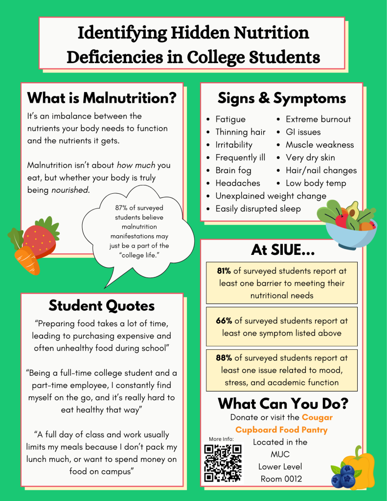 If more than half of just 47 surveyed students are already experiencing the physical and emotional manifestations of malnutrition, while also facing many barriers to accessing the nutrition they need, imagine how many more college students, not only at SIUE, but worldwide, are experiencing the same invisible battle. This is more than a statistic; it’s a reality that represents exhausted students sitting in classrooms, struggling to focus, feeling physically drained, and carrying burdens no one else can see. Malnutrition on college campuses is not always visible, but its consequences are real, affecting energy, mental health, academic performance, and overall well-being. Ignoring it allows students to continue suffering in silence. Recognizing it gives us the power to create change, to ensure that no student’s potential is limited by something as fundamental as nourishment.