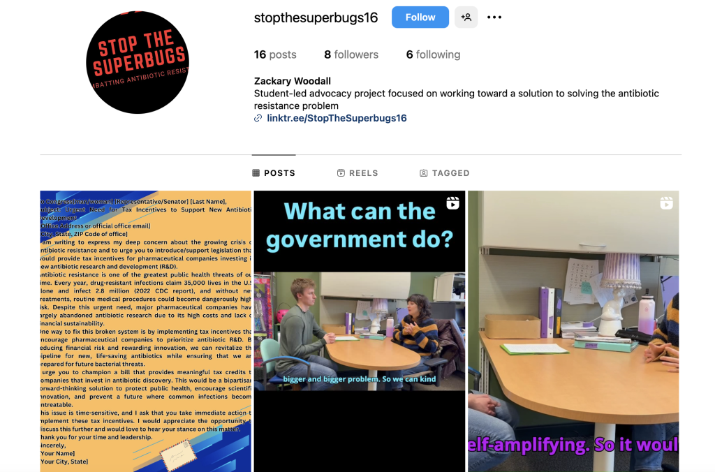 For this project, I designed an educational Instagram page centered around solving the issue of antibiotic resistance. Bacteria are rapidly evolving to become resistant to the antibiotic medications we have today, causing 2.8 million infections and about 35,000 deaths (CDC). In this page I outline ways in which the public can learn about this issue and what they can do to help. I got to personally interview a microbiology professor at SIUE to help inform my project. Her interview is featured throughout the page. I hope everyone is able to learn more about this issue! If the link doesn’t work search “stopthesuperbugs16” on Instagram.